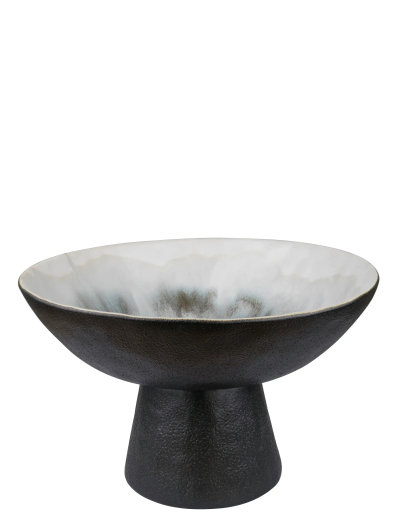 BY HAND bowl on foot fra Mette Ditmer er en dekorativ skål, hvor kunstnerisk leg møder naturlig enkelthed. Den håndglaserede overflade i matte nuancer af off-white, grå og brunsort skaber et organisk farvespil, hvor glasuren flyder sammen i intuitive mønstre og gør hver skål helt unik. Den uregelmæssige form og den matte finish giver skålen et roligt og balanceret udtryk med masser af karakter.