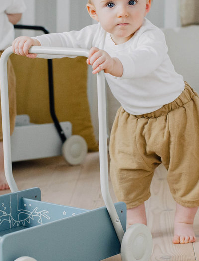 Mickis klassiske gåvogn i træ! vognen giver stabil og sikker støtte ved barnets første skridt og har hjul med bremser samt justerbart håndtag. når barnet har lært at gå, kan håndtaget justeres og vupti! så har i en sjov legevogn i flere år. måske skal klodserne køres et sted hen, eller bamsen vil med på en tur? lad legen vise vejen!