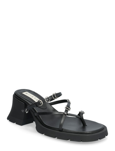 Disse højhælede sandaler har slanke remme og en markant blokhæl, der giver en moderne silhuet. Metalringdetaljer tilføjer et strejf af edgy elegance, mens den subtile platformsål giver ekstra komfort.