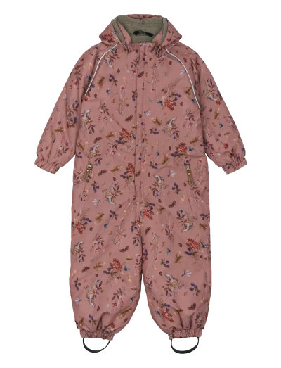 VandtætMikk-line junior snowsuit featuring a nice wildflower print. In this quality snowsuit, the child can enjoy outdoor activities and adventures while staying warm, dry, and comfortable in wet, windy, cold, and snowy winter weather. This snowsuit is made with recycled polyester and has fluorine-free coating (BIONIC-FINISH® ECO). It contains polyester padding, and the hood, inside cuffs, and upper body have soft fleece lining. The sleeves and legs have sleek, frictionless taffeta lining, which is dyed with Solution Dye to reduce our consumption of water, chemicals, and energy. EXCELLENT & FUNCTIONAL DESIGN- Feminine wildflower AOP (all-over print). - Side pockets with zippers to store small treasures, snacks, gloves etc. - Smooth-running YKK zipper with chin protection makes it easy and safe to open and close the snowsuit.- Elasticated cuffs at hands and feet for a nice, reliable, and warm fit.- Detachable hood with snap buttons that are easy to pull off in case the child gets stuck.- Place the adjustable and hard-wearing silicone foot straps underneath the wellies/boots to prevent the pants from sliding up and keep the feet dry.- Adjustable elastic inside the waist to make it fit the child perfectly. - Name tag with room for more than one name, so please let it be re-loved. TECHNICAL ADVANTAGES- Windproof and insulating with fleece lining to keep the child warm and protected agains