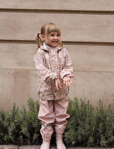 VindtætPU rainwear from mikk-line featuring a cool insect print on the jacket and solid-colored rain pants. The jacket has a "magical" effect where the white parts of the pattern change color when they make contact with water. Made from 100% recycled and soft PU material, this rainwear is designed for kids to embrace the rain and enjoy activities like jumping in puddles, sliding down wet slides, and playing in the damp sandbox. Adjust the foot straps under the boots to keep feet dry and prevent the pants from riding up. The set includes an internal name tag with space for multiple names, so feel free to pass it on for another child to enjoy.Size 74-104: Overalls that cover both the stomach and back, with adjustable suspenders and clip fasteners.Size 110-152: Regular pants with adjustable elastic waistband.EXCELLENT & FUNCTIONAL DESIGN- Jacket with color-changing print pattern.- Solid-colored pants.- Soft fleece lining around the collar.- Hidden YKK zipper with pull tab.- Chin guard (zipper garage).- Elastic cuffs on sleeves and pants legs.- Detachable hood.- Adjustable foot straps.- Strong reflective details.- Name tag.TECHNICAL ADVANTAGES- Waterproof (water column pressure 8,000 mm).- Welded waterproof seams.- Windproof.- Durable material.- Dirt-resistant.- Easy to clean.- Nickel-free.- Certified by OEKO-TEX® Standard 100