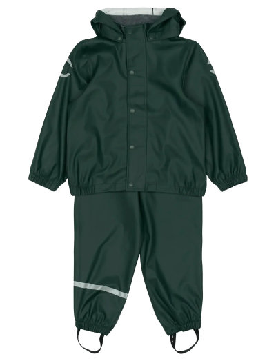 VandtætMikk-lines classic PU rainwear set with suspenders. This rainwear set is made of waterproof fabric from 100% recycled PU material, and it is designed for children to have fun in the rain, jumping puddles, sliding down the wet slide, playing in the wet sandbox etc. Place the adjustable foot straps underneath the wellies/boots to prevent the pants from sliding up and keep the feet dry. The set also features a name tag with room for more than one name, so please pass it on and let it be re-loved. EXCELLENT & FUNCTIONAL DESIGN- Solid-coloured.- Adjustable braces/suspenders with click buckles. - Fleece lining around the neckline.- Smooth-running YKK zipper with pull tab.- Zipper coverage. - Chin protection (zipper garage).- Elasticated cuffs at hands and feet.- Detachable hood with snap buttons.- Adjustable foot straps. - Strong reflective details. - Name tag. TECHNICAL ADVANTAGES- 100% recycled PU plastic. - Waterproof fabric and welded seams (water pressure 5,000 mm). - Windproof.- Wear-resistant material. - Easy-to-clean.- Dirt repellent. - Nickel-free.- OEKO-TEX® Standard 100, Class 1