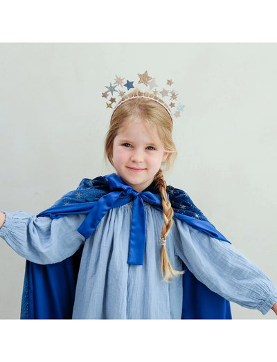Hårbøjle med satinbånd og en høj dekoration med glitrende stjerner i mange forskellige former og nuancer.Et festligt hovedsmykke. Alder: 3-8 år