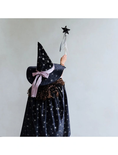 Sort velourkappe, dekoreret med gyldne stjerner, rosa for og bindebånd. Alder: 3-8 år