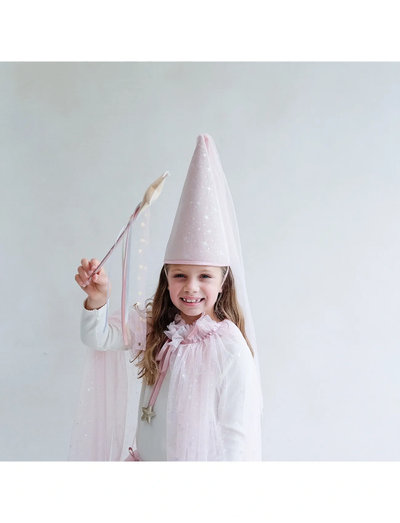 Spids fehat eller prinsessehat i en fin, lyserød farve dekoreret med guldstjerner, påhæftet slør og elastisk satinrem. Alder: 3-8 år