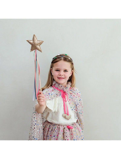 Spred magisk støv med denne fine tryllestav med en stor, gylden stjerne på toppen. Fra stjernen går en hale af smukke og farverige satinbånd. Stjernen er placeret sikkert på en pind, betrukket med satinbånd.