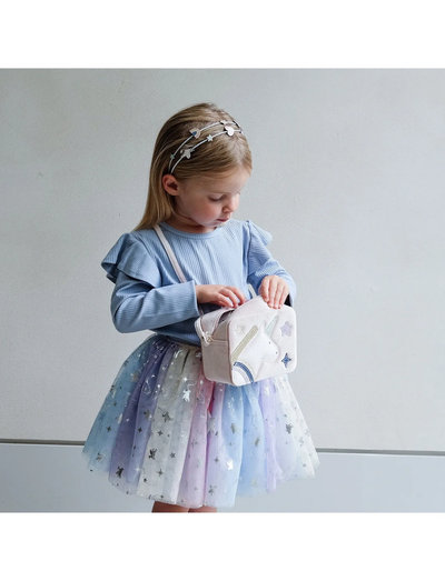 Tylskørt med et smukt ombre farvespil, dekoreret med funklende stjerner, elastik i taljen og bindebånd i lyserødt satin med gyldne stjernevedhæng.