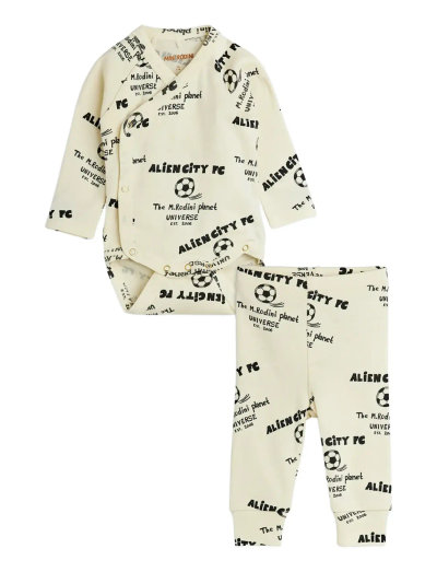 Dette babysæt har et legende allover-print og inkluderer en langærmet body og matchende bukser. Bodyen har trykknapper, der gør det nemt at skifte, mens bukserne giver en behagelig pasform til hverdagsbrug.