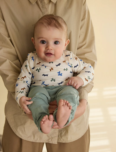 Long-sleeved bodysuit from Minymo. The bodysuit has an all-over print. It closes with snap buttons between the legs. The bodysuit is made of a cotton blend. Certified acc. to GOTS - organic CERES-0366