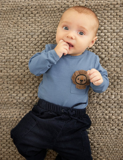 Plain long-sleeved body from Minymo with a cute chest pocket featuring a lion motif. Made from a soft cotton blend that feels comfortable against the skin. Fastens with snap buttons between the legs. Minymo logo near the leg.