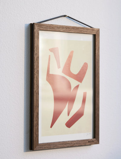 Fire trælister, to stykker akrylglas og en elastik. Den enkle, men smarte konstruktion bruger elastikken til både at holde rammen samlet og som ophæng til væggen. Den kan hænges både vandret og lodret og kan endda ses fra begge sider, hvilket giver dine kunstværker eller fotografier den opmærksomhed, de fortjener.