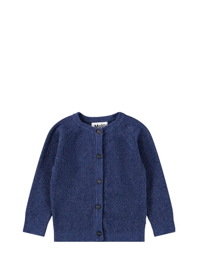 Denne mørkeblå strikcardigan fra Molo er fremstillet i en blød bomulds- og uldblanding og har et smilende ansigt på ryggen. Cardiganen har rund halsudskæring med ribkant, ribkant i taljen og på ærmerne samt knaplukning foran.