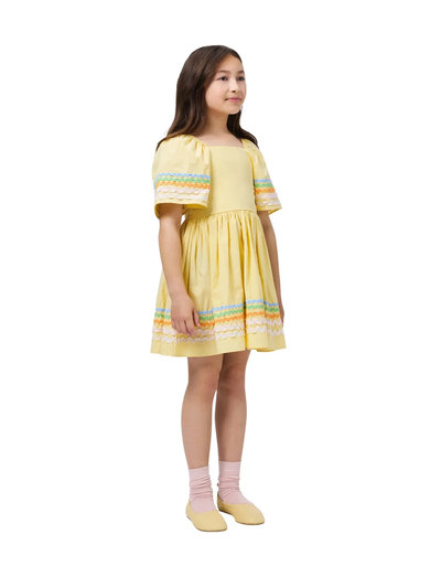 This knee-length dress offers a lightweight cotton construction, designed with short puff sleeves and a wide smock back for comfortable wear. The dress features a discreet side zipper and a square neckline, while colorful wave bands on the sleeves and skirt infuse a playful, summery vibe, making it perfect for any occasion.