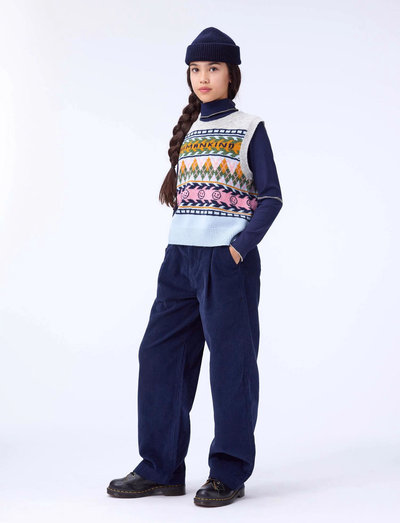 This multicolored knitted wool vest from Molo is Nordic inspired with smiling faces and the text 'Humankind' on the front and back. The vest has ribbed edges around the neckline, sleeves, and waist.