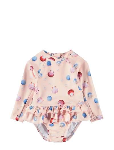 This adorable swimsuit for toddlers combines playful ruffles and long raglan sleeves for a stylish look during water adventures. With a handy zip closure at the back and snap buttons at the crotch, changing nappies is quick and easy. The snug elastic lining ensures comfort and support, making it perfect for splashing around or lounging by the pool.