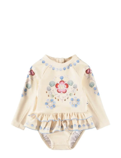 This adorable swimsuit for toddlers combines playful ruffles and long raglan sleeves for a stylish look during water adventures. With a handy zip closure at the back and snap buttons at the crotch, changing nappies is quick and easy. The snug elastic lining ensures comfort and support, making it perfect for splashing around or lounging by the pool.