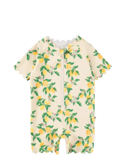This charming swimsuit is perfect for young adventurers, featuring an enchanting ice print that fuels creativity. With short sleeves and legs, it offers comfort and protection for sensitive skin against the sun. The convenient front zip ensures effortless dressing, while the soft wave edges give it a lovely, playful detail that kids will adore.