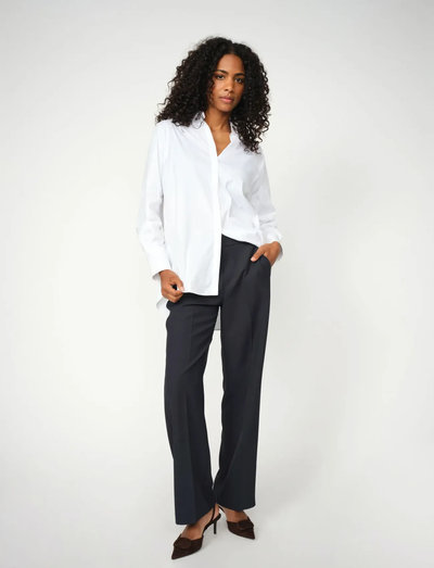 Disse skræddersyede bukser har en lige pasform og en behagelig mid-til højtaljet talje, hvilket gør dem til en perfekt tilføjelse til enhver klassisk garderobe. De er designet med pressede folder for et skarpt look og en skjult lynlås for en elegant finish. Brug dem med en feminim bluse og en matchende blazer.