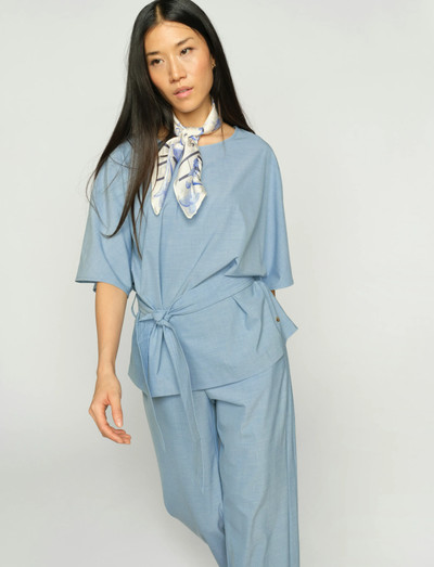 Denne kortærmede bluse har et bindebælte i taljen, der giver en flatterende silhuet. Det lette stof og den afslappede pasform gør den ideel til varmere vejr.