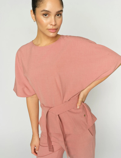 Denne kortærmede bluse har et bindebælte i taljen, der giver en flatterende silhuet. Det lette stof og den afslappede pasform gør den ideel til varmere vejr.