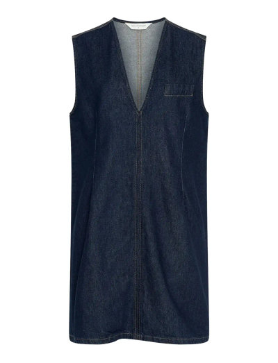 Denne kjole er fremstillet i et ærmeløst design og har en flatterende V-hals og en enkelt brystlomme for ekstra detalje. Denimkonstruktionen giver en struktureret, men komfortabel pasform, hvilket gør den til et alsidigt valg til forskellige lejligheder.