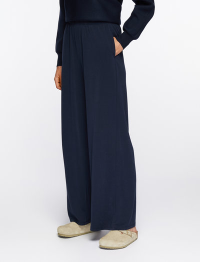 Disse bukser med brede ben har en behagelig elastisk talje og giver et afslappet fit og ubesværet stil. Den flydende silhuet gør dem ideelle til både afslappede og mere formelle lejligheder.