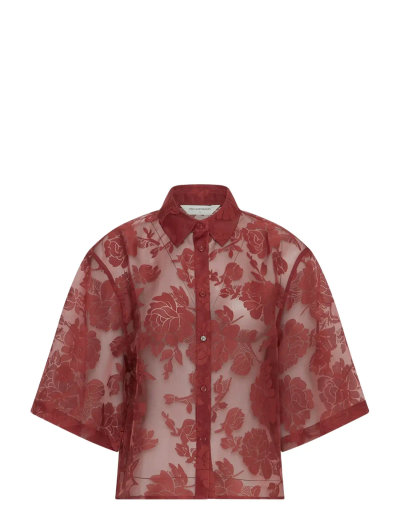 Det transparente blomstrede stof giver denne kortærmede skjorte et karakteristisk, tekstureret look. Designet med knapper giver mulighed for alsidig styling, uanset om den bæres åben som et let lag eller knappet for et mere poleret udseende.