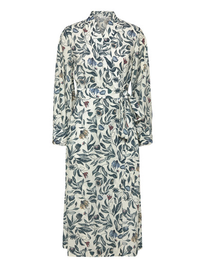 Denne elegante slå-om-kjole har et fint blomsterprint. Kjolen har lange, løse ærmer med manchetter og et elegant bindebælte i taljen. Vi bestræber os på at producere styles med print med minimalt spild. Det betyder, at der er små forskelle i mønsterets placering på hver style, og alle styles med print er derfor unikke.