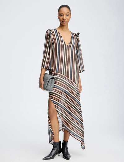 Denne kjole har en asymmetrisk kant og glitrende detaljer, der giver et markant udtryk. De vertikale og diagonale striber skaber visuel interesse, mens et bindebælte fremhæver taljen. En fin sløjfe i nakken fuldender designet.