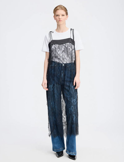 Denne elegante blondekjole er fremstillet af fine blonder og har tynde, justerbare stropper. Den asymmetriske kant forneden giver et moderne udtryk. Brug den alene, eller style den med en underkjole.
