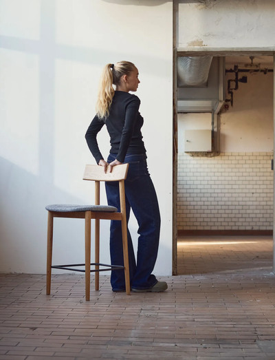 Barstolen er udført med enkle detaljer og et blødt sæde i grå nuancer, som tilsammen danner et flot farvespil med masser af dybde. Træets struktur fremhæves af naturolie.