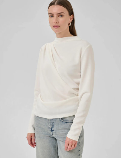 HelleMW-blusen er en elegant og flatterende top, der kan styles til enhver lejlighed. Den har en høj halsudskæring og en smuk draperet forside. Ærmerne er lange med en slank pasform, og blusen er lavet i et blødt og strækbart stof.