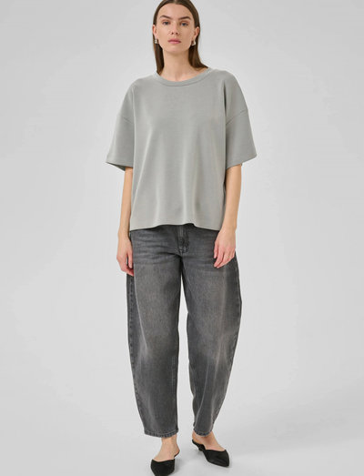 Denne kortærmede T-shirt har en afslappet silhuet og et boxy fit, der går til hoften. Den er alsidig og kan nemt kombineres med jeans eller nederdele for et afslappet, men stilfuldt look.