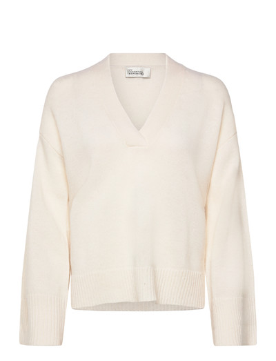 Denne striktrøje har en flatterende V-hals og en afslappet pasform, der gør den behagelig at have på hver dag. Strikken har en lige kant forneden og ribdetaljer ved ærmerne og bunden, hvilket giver et diskret tekstur til det enkle design.