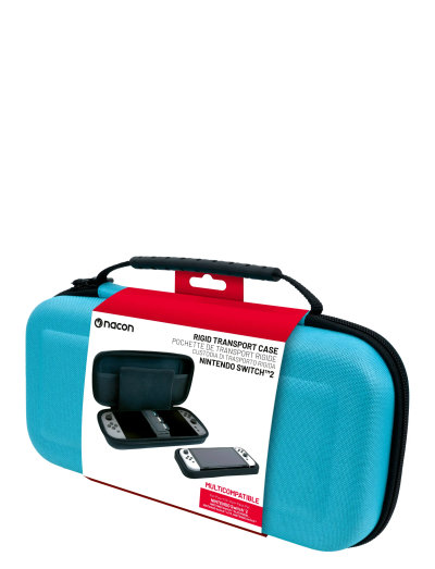 Rigid transport case, compatible with Nintendo Switch™2, Switch™ OLED, and Switch™ Lite consoles via a removable stand. Its durable design and materials protect your console from damage, while an inner compartment offers convenient storage for your mains adapter and games, ensuring secure transport.