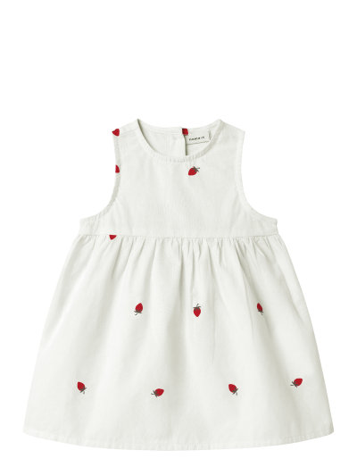 Denne ærmeløse kjole er perfekt til varme dage. Den har en rund halsudskæring og et sødt jordbærprint. Kjolen er lavet af blødt og behageligt stof, hvilket gør den ideel til hverdagsbrug.