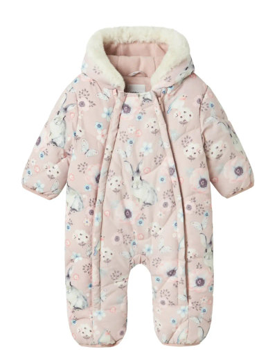 Denne flyverdragt har et dejligt blomster- og kaninprint, der sikrer varme og komfort på kolde dage. Den plysforede hætte tilføjer et ekstra lag af hygge, hvilket gør den perfekt til udendørs eventyr.