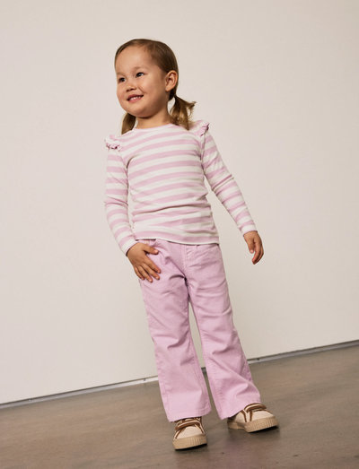 Denne stribede langærmede top har en klassisk rund hals og en stilfuld flæsedetalje på skuldrene. Den er et komfortabelt og alsidigt stykke, der kan klædes op eller ned.