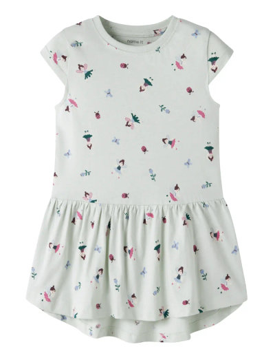 Denne kortærmede kjole har et blomsterprint over det hele og er en charmerende tilføjelse til ethvert barns garderobe. Det bløde jerseystof sikrer en behagelig pasform, der giver masser af bevægelsesfrihed, hvilket gør den ideel til hverdagsbrug.