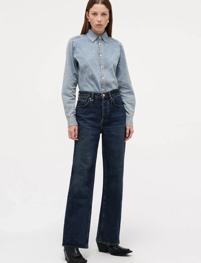 Disse jeans er designet med en høj talje og åben top, hvilket giver mulighed for en personlig pasform. De har fuld længde og lige ben, hvilket skaber en moderne silhuet, der kombinerer komfort og stil. Disse alsidige jeans har knaplukning, fem lommer, signatur reparationssting og en nøglering. Brug dem i din normale størrelse for et skræddersyet look, eller gå en størrelse op for et mere afslappet look.