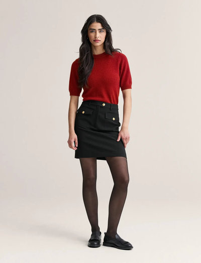 Denne korte nederdel er fremstillet af et let tekstureret crepe-stof, der falder smukt. Den har påsyede lommer foran, hver med iøjnefaldende gyldne logoknapper.