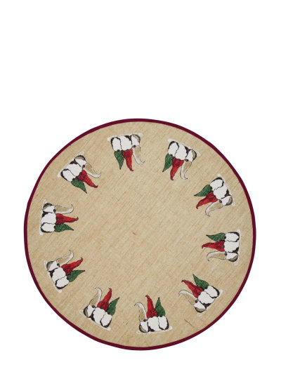Beautiful Christmas tree mat with a decorative printed pattern of elves that form a ring around the center where the tree will stand. The Christmas tree mat has a plastic back that protects your floor against minor water leaks.