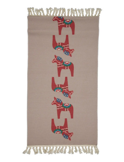 A fun rug that is rustically woven with a lovely print of colorful Dala horses and nice fringes as a finish. With this nice rug it is easy to raise the festive mood.
