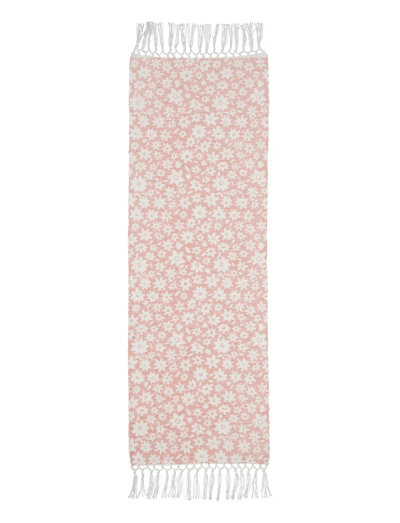 This spring's beautiful runner with a printed flower on the fabric's nice, slightly wrinkled quality. To give the whole runner a little life and elegance, it also has a fringe with a knot on each side.