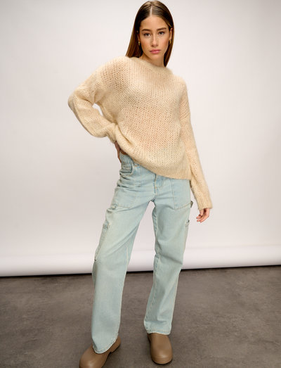 Denne superbløde strik er strikket med store strikkepinde, hvilket giver den et let og luftigt udseende. Designet har store ærmer, som giver en afslappet pasform, og fuldendes med ribkanter ved ærmer, forneden og i kraven.
