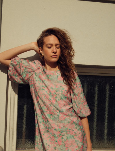 Denne korte kjole har en fin bindedetalje bagpå, der giver et elegant touch. Designet har luftige ærmer, der er perfekte til varmere vejr, og en afslappet pasform, der gør den behagelig at have på.