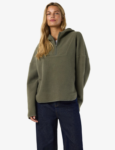 Denne hættetrøje er et solidt fundament for enhver garderobe og giver uendelige stylingmuligheder. Den har lange ærmer med dropped shoulders og en halvvejs lynlås, og det afslappede fit gør den til en behagelig og alsidig tilføjelse til din samling.