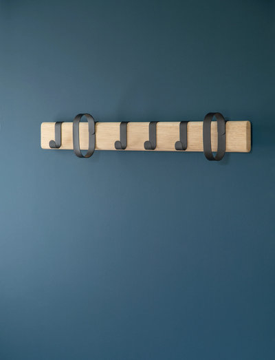 knagerækken er lavet af fsc®-certificeret eg og mat sort pulverlakeret metal. skruer og standard rawlplugs til vægmontering medfølger.