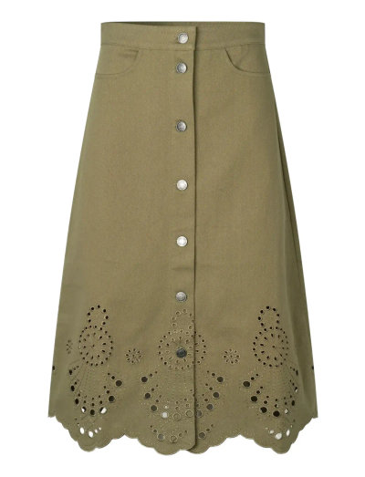 Denne nederdel er fremstillet af ren bomuld og giver en behagelig og åndbar pasform. Designet har en knaplukning foran og fine, dekorative udskæringer langs kanten, hvilket tilføjer et moderne flair. Det er en alsidig beklædningsgenstand, der er ideel til at skabe selvsikre og stilfulde looks til hverdagsbrug eller særlige lejligheder.