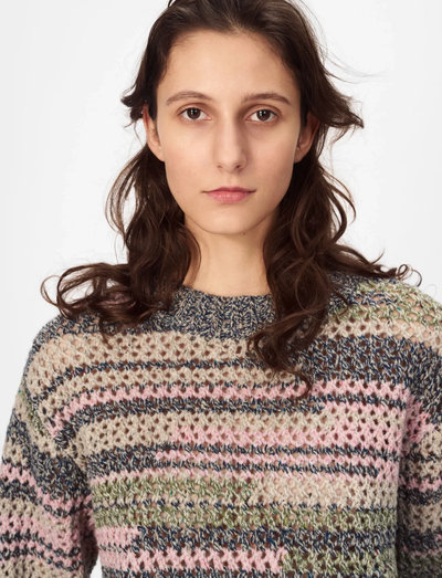 Denne pullover har en tekstureret, åben strikkonstruktion, der giver et unikt visuelt udtryk. Den afslappede pasform sikrer behagelig brug, mens den subtile mélangeeffekt tilføjer dybde til det samlede design. En alsidig beklædningsgenstand, der kan bruges lagvis eller alene.